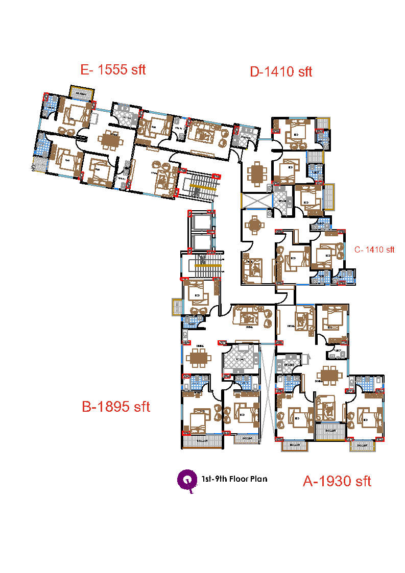 entrance Area, SFT Lift Stairs Basements parking CC Camera floor Al-Aksha Matrichaya Sagor Para, Boalia, Rajshahi Building Description + _ Building face & Road size: North facing with 40 feet wide road. Building Height: 9 Storied (G+08). Ground Floor for Car Parking. Fully Residential Purpose. 5 (Five) flats per floor. Unit Size: Type A- 1930, B- 1895, C- 1410, D- 1410 and E- 1555sft (Approx). Unit Details: Each flat consist of 3 Beds, Living, Dining, 2/3 Balconies, 3 Toilets & Kitchen. Community Hall & Garden at Rooftop. 02 Passenger Lifts & 02 Stairs. Firefighting arrangement. CCTV and Lightning Protection System. Stand by Generator. See it in action schedule a visit Reachout to us to get know more about us and our projects Request